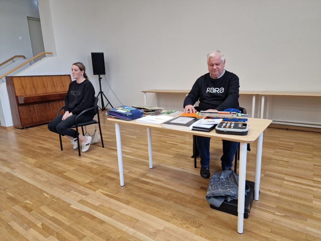 Panen näidisteks kaasa võetud heliraamatud, punktkirjaraamatud ja puuteraamatud Tallinna Puuetega Inimeste Koja saali lauale. Võtan kätte lehed punktkirjas märksõnadega ja ütlen, et mina ettekandega ei esine ja loengut ei pea. Saalis on mitu sekundit vaikust. Jätkan, et teeme hoopis vestluse. Sellega nõustutakse ja esinemine enam kui poolesajale huvilisele kestab ligi tunni. Kurtidele inimestele vahendab räägitavat viipekeeletõlk ja Katrin Jõgisaar teeb foto.