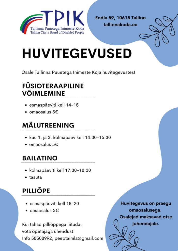 Tallinna Puuetega Inimeste Koda kutsub kõiki huvilisi osalema mitmekesistes huvitegevustes, mis toetavad nii füüsilist kui ka vaimset heaolu.