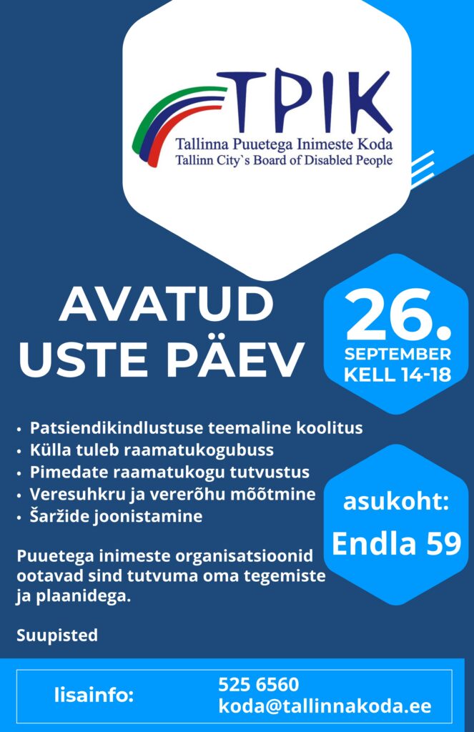 Ootame Sind avatud uste päevale, mis toimub reedel, 26. septembril 2025 kell 14.00–18.00 Tallinna Puuetega Inimeste Kojas (Endla 59). Tänavuse päeva teemaks on raamatuaasta ning programm pakub nii harivaid kui ka meelelahutuslikke tegevusi. Päeva jooksul toimuvad: Samuti tutvustavad end puuetega inimeste organisatsioonid, kellega saab suhelda ja kuulda nende tegemistest ning tulevikuplaanidest. Pakume ka kergeid suupisteid.